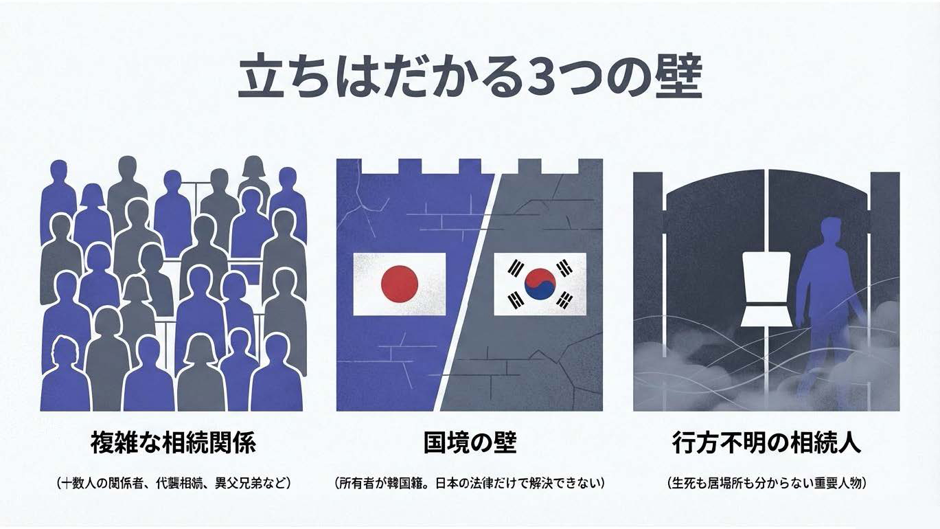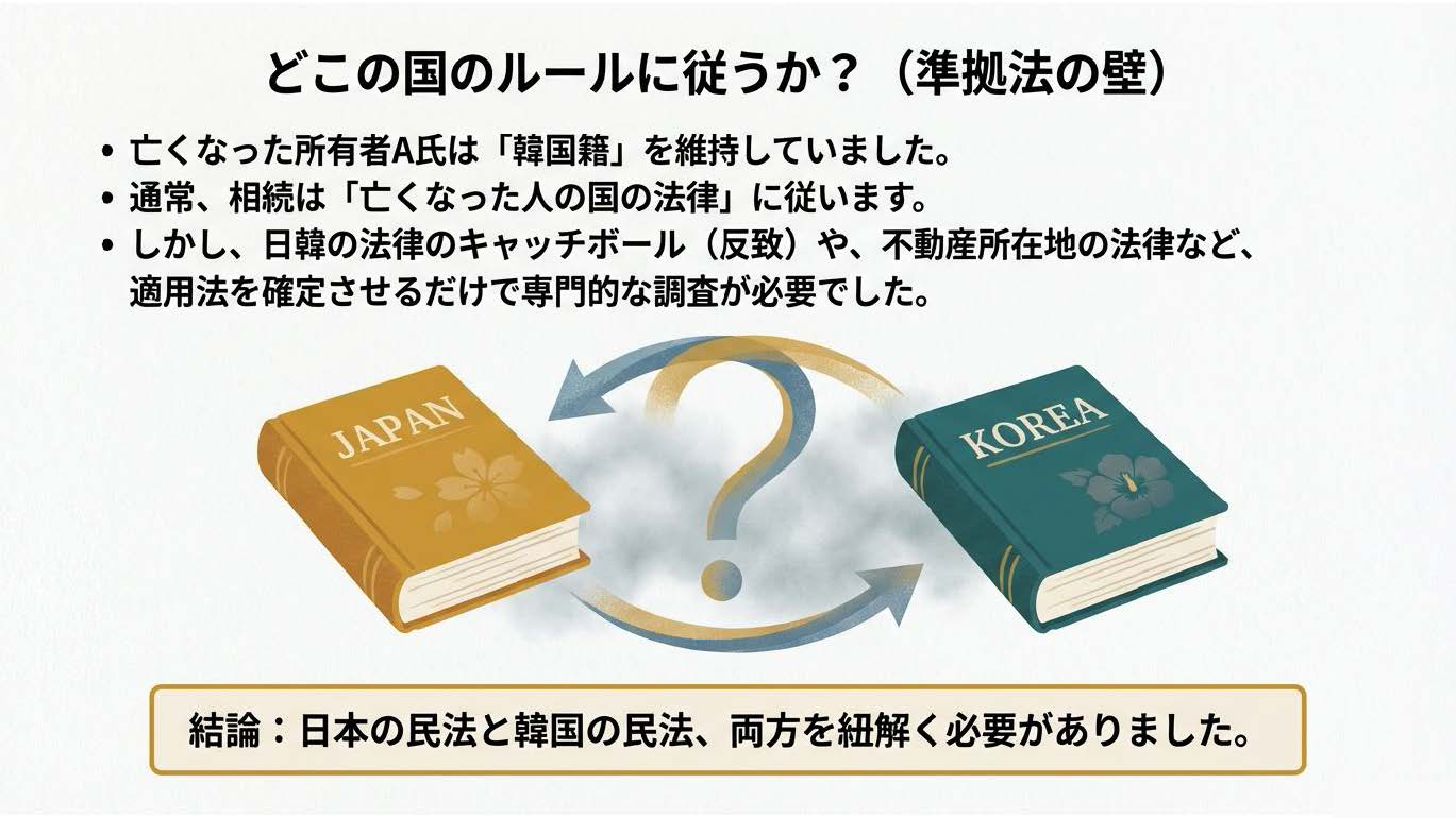 所有者A氏は韓国籍を維持しており、日本の不動産であっても、相続にあたっては日本法だけで即断できない問題がありました。どの国の法律に従って相続関係を考えるべきか、慎重な検討が必要でした。