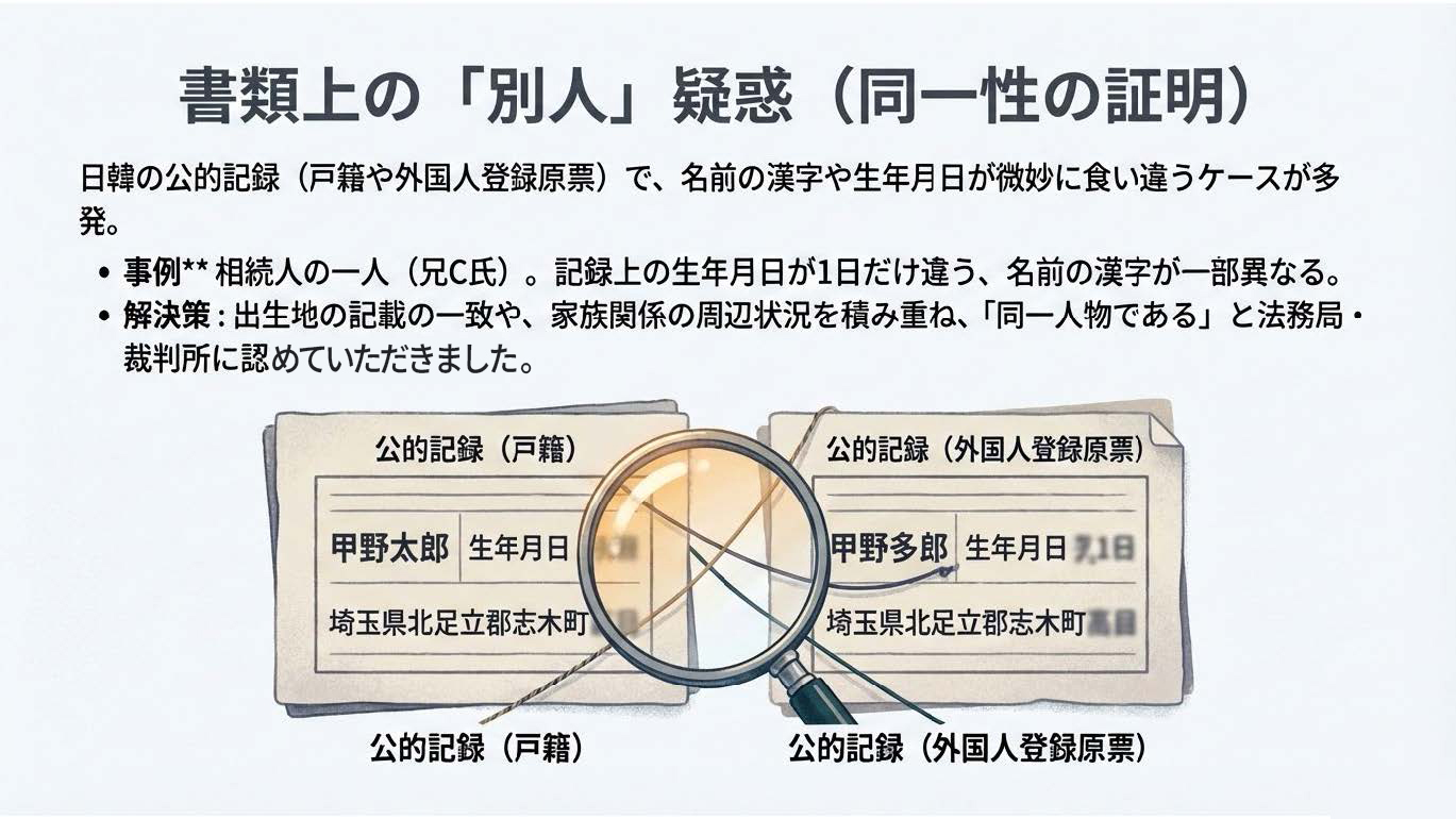 このように、記録の一部不一致があっても、周辺事情を積み重ねることで、法務局や裁判所に対して同一性を認めてもらえる場合があります。複雑な案件では記録の一部分だけで判断せず、戸籍・登録情報・家族関係・周辺事情を総合的に整理しながら、前に進めるための説明を組み立てています。
