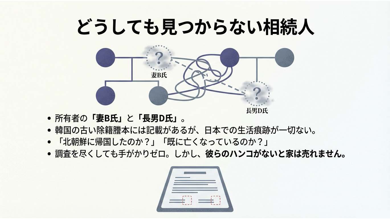 相続人のうち、妻B氏と長男D氏については記録はあるものの、日本での生活痕跡が見当たらず、生死や所在が確認できない状態でした。しかし、彼らの関与を外したままでは売却を進めることができませんでした。