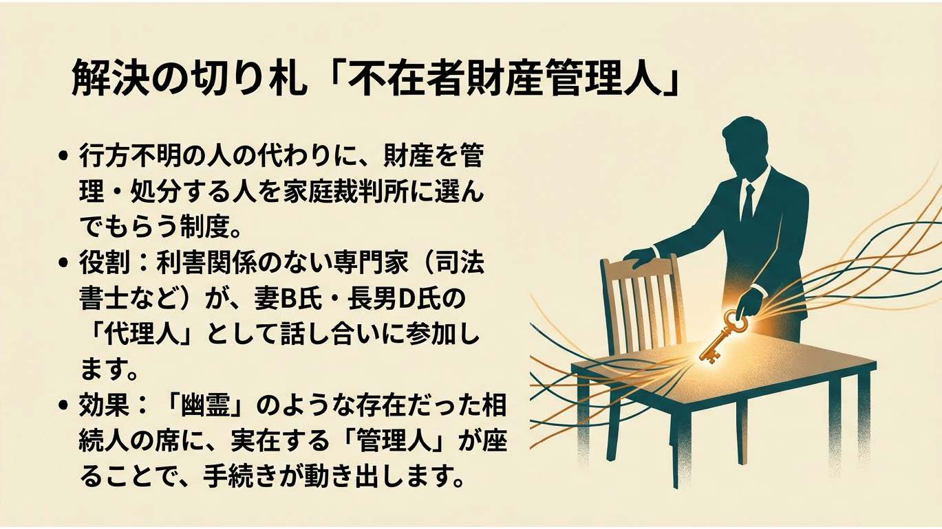 そこで活用されたのが、不在者財産管理人の制度です。これは、行方不明の人に代わって、その人の財産を管理・処分するための管理人を家庭裁判所に選任してもらう制度です。本人の所在が分からず、しかし権利関係の整理を進めなければならない場面で、非常に重要な役割を果たします。