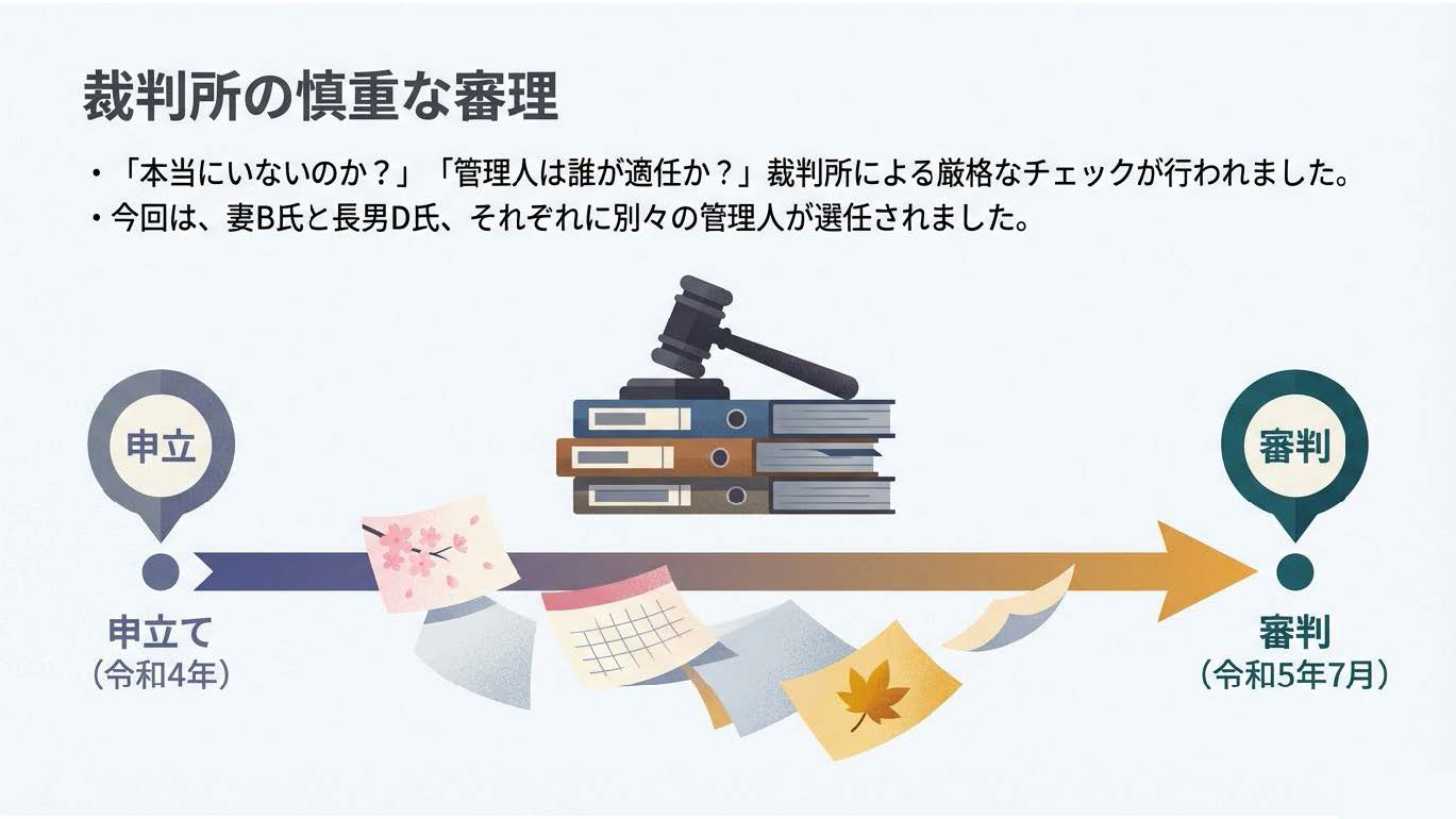 今回は、妻B氏と長男D氏それぞれについて、別々の管理人が選任されました。申立てから審判までには相応の時間がかかり、手続きは一足飛びには進みませんでしたが、その分だけ法的な土台はしっかり固められました。複雑な案件ほど、急いで形だけ整えるのではなく、裁判所の関与も含めて手続きを丁寧に積み上げることが、最終的な解決の確実性につながります。