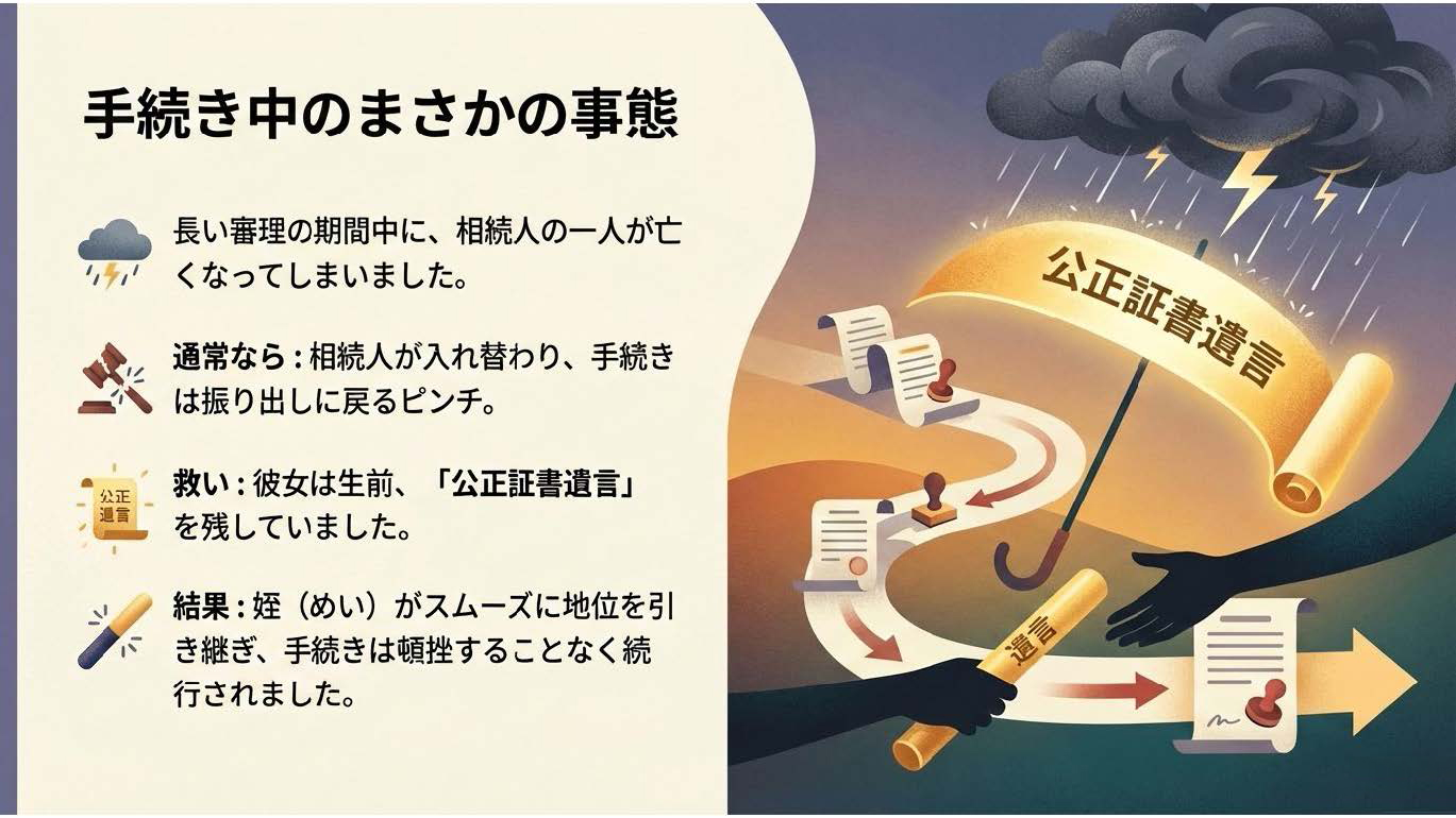 通常であれば、ここで新たな相続が発生し、関係者が入れ替わり、手続きが大きく振り出しに戻るおそれがあります。ただでさえ長期化している案件にとって、これは非常に大きなリスクです。