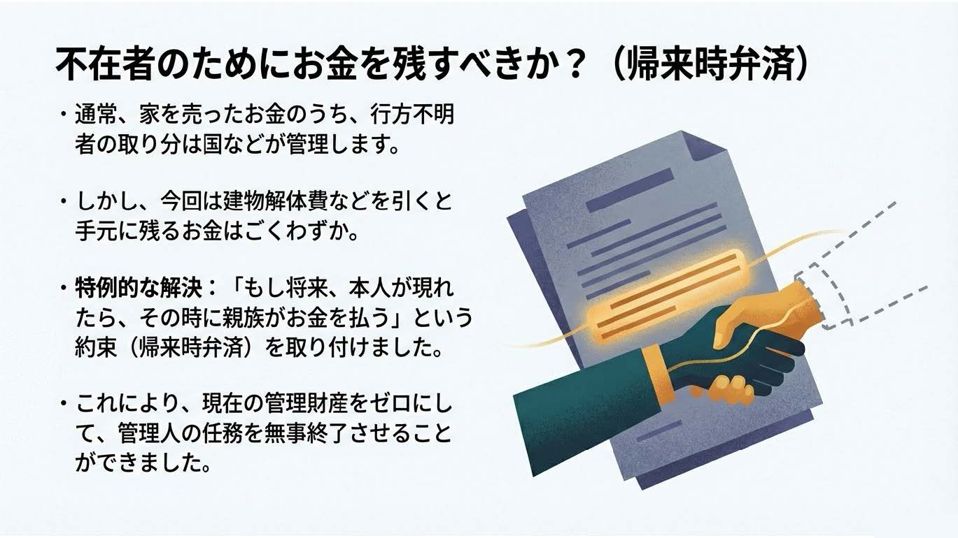 しかし今回の案件では、建物解体費などを差し引くと、手元に残る金銭はごくわずかでした。そこで、特例的な整理として、「もし将来本人が現れたら、その時に親族が支払う」という約束、すなわち帰来時弁済を取り付ける形が採られました。